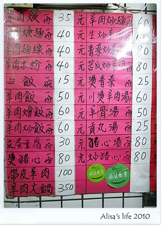 實際上的價錢我也不清楚..記得沙茶炒羊肉一盤是120元..炒麵和羊骨湯應該都是50-80之間吧..